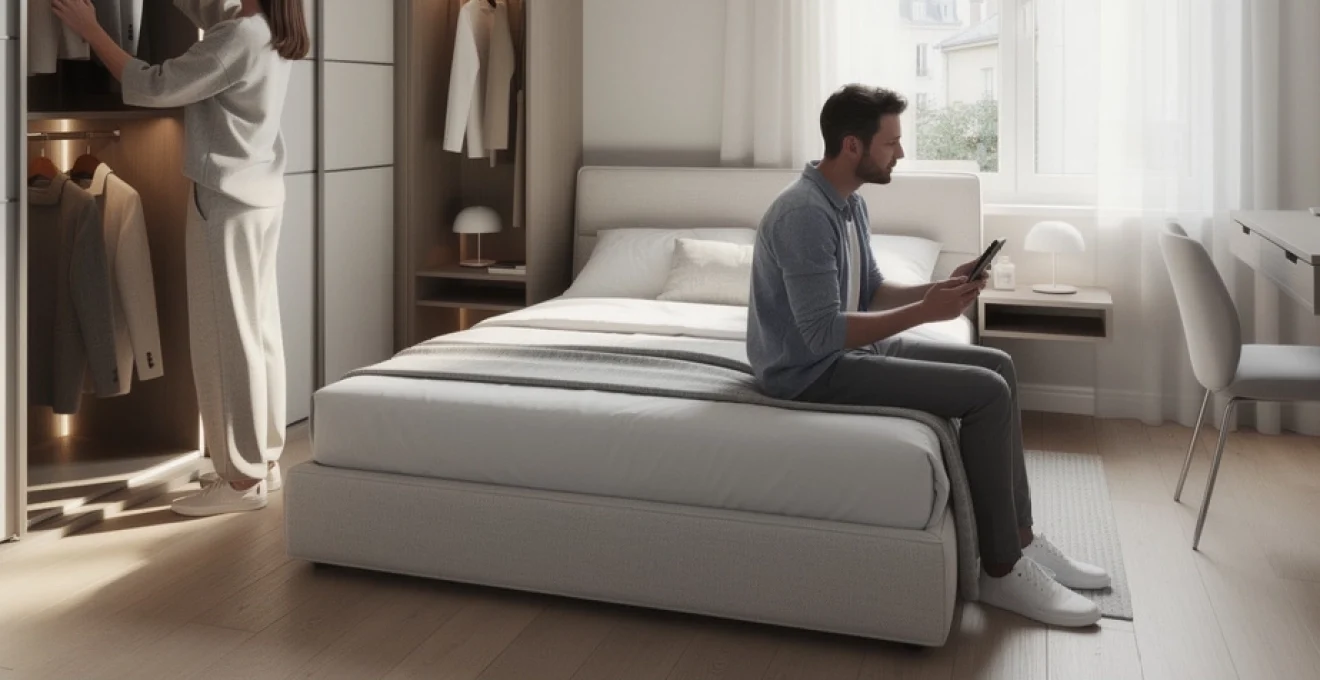 Dans une chambre de 16m², quelques centimètres gagnés de chaque côté du lit peuvent faire la différence entre un passage de 55 cm (trop serré) et 65 cm (confortable). Pensez aussi aux tablettes rabattables ou coulissantes qui se rangent après usage, notamment du côté opposé au dressing. L’objectif est de maintenir des zones de circulation dégagées, en particulier dans l’axe d’entrée de la chambre et vers le dressing, sans renoncer au confort d’un chevet pour poser lampe, livre et téléphone.